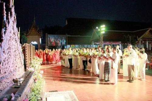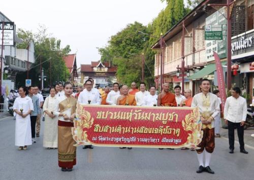 จากนั้น เวลา 19.00 น. ที่วัดพระธาตุหริภุญชัย วรมหาวิหาร ผู้ว่าราชการจังหวัดลำพูน เป็นประธานในพิธีเวียนเทียน และถวายผ้าห่มองค์พระธาตุหริภญชัย และเจดีย์ปทุมวดี "วันมาฆบูชา สืบสานตำนานสองเจดีย์" ประจำปี 2569โดยมีพระเทพรัตนนายก เจ้าคณะจังหวัดลำพูน นางณัษฐพร ชูวงศ์ นายกเหล่ากาชาดจังหวัดลำพูน นางสาวเบญจวรรณ มีเผือก รองผู้ว่าราชการจังหวัดลำพูน หัวหน้าส่วนราชการ ข้าราชการ นักเรียน ประชาชน พุทธศาสนิกชนชาวจังหวัดลำพูน นักท่องเที่ยวและหน่วยงานที่เกี่ยวข้องเข้าร่วมจำนวนมาก